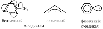 Эти радикалы относятся к π-типу, поскольку неспаренный электрон расположен на однократно занятой молекулярной орбитали (ОЗМО), имеющей π-симметрию. К π-радикалам относятся также бензильный и аллильный радикалы, однако фенильный радикал является σ-радикалом, так как неспаренный электрон в этом случае располагается на sp2-гибридной орбитали.