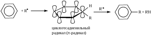 Радикалы бывают π-типа и σ-типа. Например, в реакциях ароматического замещения под действием радикальных частиц возникают промежуточные короткоживущие циклогексадиенильные радикалы: