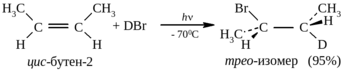Радикальное присоединение к 1,2-дизамещенным алкенам обычно нестереоселективно. Например, CH3S• в реакции с цис- или транс-бутеном-2 дает одну и ту же смесь эритро- и трео-изомеров. Однако HBr при достаточно низкой температуре и при большом избытке HBr присоединяется почти стереоспецифично (транс-(анти)-присоединение):