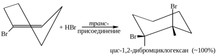Присоединение к циклоалкенам часто очень стереоселективно. Для тиильных, силильных, нитроксильных радикалов и атомов брома наблюдается предпочтительное транс-присоединение к замещенным циклогексенам, например: