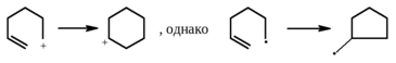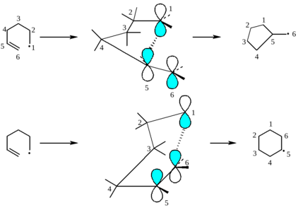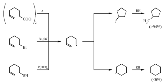 Необычность такого пути реакции состоит в том, что исходный гексен-5-ил-1-радикал циклизуется с образованием термодинамически менее стабильного радикала. В этом отношении циклизация радикала резко отличается от циклизации аналогичных карбокатионов, которые всегда превращаются в шестичленые циклические продукты: