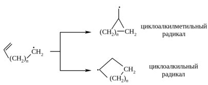 Алкенильные радикалы типа CH2=CH(CH2)nCH2• могут циклизоваться путем реакции внутримолекулярного присоединения к двойной связи. В зависимости от длины цепи и типа заместителей в радикале могут образовываться циклоалкилметильные или циклоалкильные радикалы:
