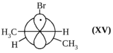 Стереоселективность этой реакции объясняется тем, что промежуточный β-бромалкильный радикал имеет заслоненную предпочтительную конформацию (XV) с высоким барьером вращения вокруг Cα – Cβ-связи. Предпочтительность заслоненной конформации обусловлена d-орбитальными эффектами атома брома (локализация неспаренного электрона на Cβ – Br-связи за счет сопряжения типа p – d и σ-π; ср. 14.2):