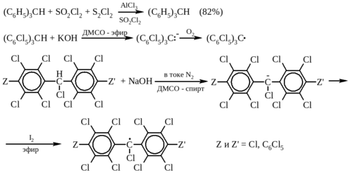 Очень стабильный перхлортрифенилметил и его диарилметильные аналоги были синтезированы в результате следующей последовательности превращений: