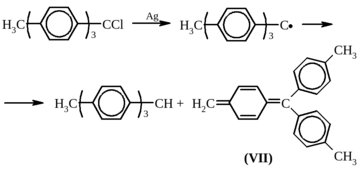 Для триарилметильных радикалов, содержащих в пара-положении алкаильную группу, характерен другой тип диспропорционирования. В этом случае радикал отщепляет атом водорода из алкильной группы, продуктами этой реакции являются триарилметан и хиноидное соединение VII, которое быстро полимеризуется:
