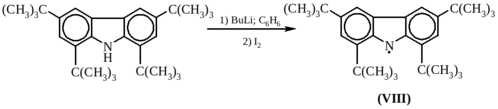 Среди немногих стабильных аминильных радикалов, выделенных в кристаллическом состоянии, специального упоминания заслуживает 1,3,6,8-тетра-трет-бутил-9-карбазил (VIII), который образуется при окислении йодом литиевой соли карбазола: