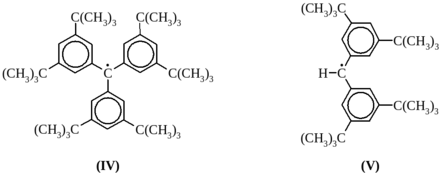 Бензильный радикал C6H5CH2• был зафиксирован как крайне нестабильная частица методом ЭПР с использованием струевой техники при отщеплении атома водорода от толуола. В отличие от этого другой бензильный радикал α,α’-ди-трет-бутилбензил (VI) стабилен в индифферентном растворителе в течение многих дней.