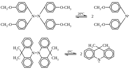 Вскоре после открытия Гомбергом триарилметильных радикалов Г. Виланд установил (1911 – 1915), что тетраарилгидразины Ar2N – NAr2 ведут себя аналогично димерам триарилметила и при нагревании диссоциируют: