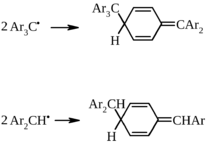 Радикалы трехвалентного углерода находятся в термодинамическом равновесии со своими димерами. Спектры ЯМР димеров триарилметильных и диарилметильных радикалов определенно указывают на их циклогексадиеновую структуру и противоречат структуре гексаарилэтана и тетраарилэтана: