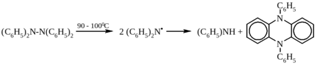 Центральная связь азот-азот в тетрафенилгидразине расщепляется при более высокой температуре (90 – 100ºС), чем C – C-связь в димере трифенилметила (имеющего метиленциклогексадиеновое строение), однако дифениламинил самопроизвольно диспропорционирует с образованием дифениламина и дифенилгидразофеназина, поэтому диссоциация тетрафенилгидразина необратима: