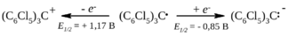 Ди- и триарилметилы легко восстанавливаются от углеводородов амальгамой натрия, цинком, HCl, и другими восстановителями. С другой стороны, эти радикалы окисляются до карбокатионов под действием солей Fe (III), Au (III), Hg (II) и т.д. в растворе жидкого диоксида серы. Окислительно-восстановительные превращения Ar3C• проще всего осуществляются электрохимически на вращающемся платиновом электроде, например:
