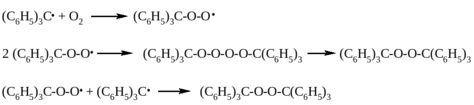 Пероксиды, получающиеся при взаимодействии кислорода с Ar2C•H, нестабильны и разлагаются с образованием Ar2CO, Ar2CHOH и Ar2CHOCHAr2. Триарилметилы присоединяют оксид азота (II) с образованием гипонитритов, которые неустойчивы и быстро превращаются в эфиры азотистой кислоты. При взаимодействии трифенилметила с другим неорганическим радикалом – оксидом азота (IV) – получаются два продукта – трифенилнитрометан и трифенилметилнитрит: