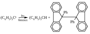 Триарилметильные и диарилметильные радикалы в растворе диспропорционируют, причем направление диспропорционирования зависит от строения радикала. Например, трифенилметил на свету диспропорционирует по следующей схеме: