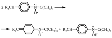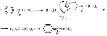Димер далее разлагается на N-трет-бутиланилин и N-трет-бутил-пара-бензохинонимин-N-оксид. Аналогичное превращение претерпевает и дифенилнитроксид. Введение в пара-положение кольца трет-алкильной группы резко повышает стабильность нитроксильного радикала, и трет-бутил-(пара-трет-бутилфенил)нитроксил устойчив в кристаллическом состоянии в течение многих месяцев. Однако арил-трет-бутилнитроксилы с первичной или вторичной алкильной группой в пара-положении легко диспропорционируют: