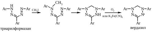 Среди разнообразных методов получения вердазильных радикалов выделим только один, в котором формазаны алкилируются алкилгалогенидом до N-алкилформазанов. Последние легко циклизуются в лейковердазилы, которые в свою очередь окисляются до радикалов кислородов или феррицианидом калия: