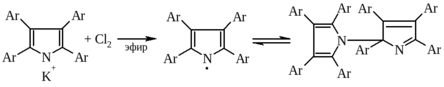 К диариламинильным радикалам по структуре примыкают тетраарилпирильные радикалы, которые были получены при окислении тетраарилпирролов диоксидом свинца или ферроцианид-ионом, а также их калиевых солей хлором; эти радикалы образуют димеры: