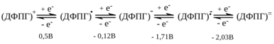 С помощью специального метода циклической вольтамперометрии получены электрохимические характеристики обратимых редокспревращений ДФПГ. Для ДФПГ обнаружены четыре одноэлектронных перехода, два из которых соответствуют катиону и аниону, а при отрицательных потенциалах выше – 1,7В наблюдается восстановление нитрогруппы до анион-радикала и дианиона: