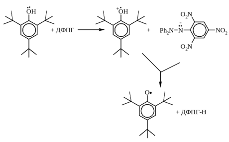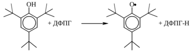 ДФПГ, подобно соли Фреми (гл. 23, ч.3), может быть использован для окисления фенолов в пара-хиноны. На радикальный механизм этой реакции указывает образование ароксильного радикала (гл. 23) при окислении пространственно затрудненного 2,4,6-три-трет-бутилфенола под действием ДФПГ:
