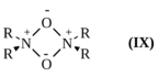 Неспаренный электрон находится на разрыхляющей π*-орбитали, образованной из 2pz-орбиталей атомов азота и кислорода. Длина связи N – O в нитроксилах мало зависит от строения радикала и составляет 1,26 – 1,28Å, т.е. имеет промежуточное значение между одинарной связью N – O в гидроксиламине и связью N = O в нитросоединениях. Большинство стабильных нитроксилов мономерны вплоть до – 260ºС, но некоторые нитроксилы димеризуются в растворе при температуре ниже – 80ºС в неполярных растворителях в диамагнитные димеры (IX):