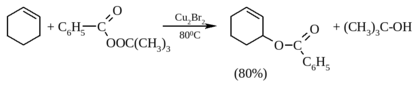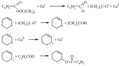 Первоначально трет-бутокси-радикал отщепляет атом водорода из аллильного положения циклогексена с образованием аллильного радикала, который далее окисляется до карбокатиона ионом меди (II). Реакция завершается присоединением карбоксилат-иона к карбокатиону.