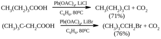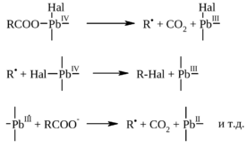В первой стадии в результате внутримолекулярного окислительно-восстановительного процесса из карбоксилата Pb (IV) получаются алкил-радикал, CO2 и частица Pb (III). Алкил-радикал далее отщепляет галоген из комплекса Pb (IV) с образованием в конечном итоге соли Pb (III) и нового алкил-радикала. В отсутствие галогенид-иона основными продуктами оказываются алкены и эфиры уксусной кислоты.