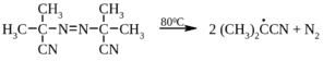 Другими источниками свободных алкильных радикалов являются азоалканы, для которых, в отличие от пероксидов (см. ниже), не характерны реакции индуцированного разложения. Способность азосоединений к радикальному распаду зависит от строения азоалкана и стабильности образующегося радикала. Если полученный радикал относительно стабилен, разложение азосоединений происходит при температуре ниже 100ºС, например, разложение азобисизобутиронитрила: