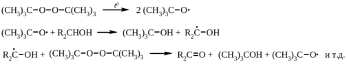 Таким образом, для индуцированного разложения по сравнению с мономолекулярным гомолизом имеют значение и структура исходного пероксида и микропримеси, и даже природа реакционной среды. При разложении диацил- и диалкилпероксидов в спирте частицей, участвующей в продолжении цепи является алкильный радикал: