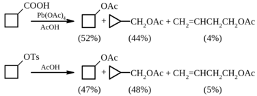 Так, при окислении циклобутанкарбоновой кислоты тетраацетатом свинца получается практически такая же смесь ацетатов, что и при сольволизе тозилата циклобутанола: