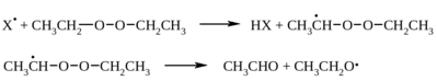 В большинстве случаев разложение пероксидов протекает с более высокой скоростью и более сложной кинетикой. такое поведение носит название индуцированного разложения. Оно наблюдается в тех случаях, когда, по крайней мере частично, разложение пероксида происходит в результате бимолекулярной реакции с участием радикалов, присутствующих в растворе. Так, например, индуцированное разложение этилпероксида может быть представлено следующим образом: