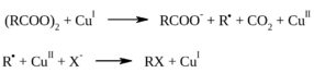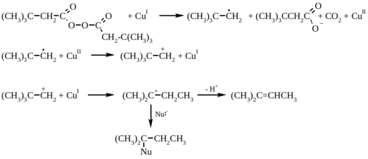Наиболее подробно исследовано разложение диацилпероксидов, катализируемое солями меди. В первой стадии из диацилпероксида получается радикал, который затем окисляется до карбокатиона. Далее карбокатион стабилизируется в результате захвата нуклеофила, отщепления протона или перегруппировки: