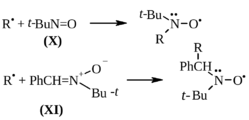 Обычно в качестве спин-ловушей используют нитрозосоединения (например, 2-метил-2-нитропропан; X) и нитроны (N-трет-бутил-α-фенилнитрон; XI), которые быстро реагируют с самыми различными короткоживущими радикалами, образуя относительно долгоживущие нитроксилы (см. 14.3.3):
