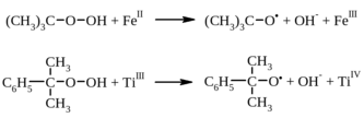 Гидроксильные радикалы далее могут реагировать со многими классами органических соединений (см. 14.5.5). Одноэлектронное восстановление органических гидропероксидов с помощью Fe (II), Cu (I), Co (II), Ti (III) и других ионов переходных металлов приводит к образованию алкоксильных, а не гидроксильных радикалов: