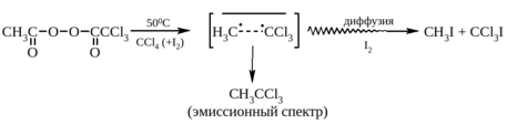 Рассмотрим простейший случай, когда R1 = CH3, а R2 не содержит магнитных ядер (т.е. Σ a2m2 = 0). Для метила константа спин-спинового взаимодействия отрицательна (a1 < 0), следовательно, второй член приведенной выше суммы положителен. Это означает, что скорость перехода к триплету будет замедляться, т.е. радикальные пары, в которых протоны находятся в верхнем спиновом состоянии, будут сохранять синглетный характер и легче реагировать с образованием продукта сдваивания. Поэтому последние будут образовываться с избыточной заселенностью протонов в верхнем состоянии. Равновесная заселенность спиновых состояний восстановится путем перехода протонов на низший уровень, что выражается появлением «отрицательных» пиков радиоэмиссии в спектрах ПМР. Именно такой спектр наблюдается для продукта сдваивания CH2CCl3, образующегося при разложении ацетилтрихлорацетилпероксида: