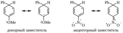 На основании большего количества экспериментальных данных можно достаточно надежно утверждать, что как электронодонорные, так и электроноакцепторные заместители направляют атаку в орто- и пара-положения. Однако предполчительность орта-, пара-атаки в данном случае выражена гораздо слабее, чем в случае электрофильного ароматического замещения (см. гл. 13). Это связано с тем, что и электронодонорные, и электроноакцепторные заместители могут делокализовать неспаренные электрон, если атака радикалом направляется в орто- или пара-положение: