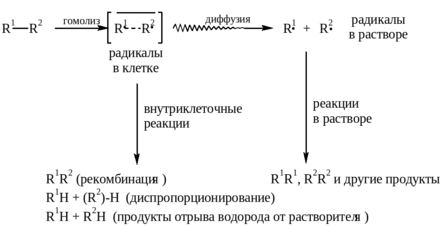 По существующей теории эффект ХПЯ возникает благодаря образованию радикальных пар. Пусть молекула R1 – R2 разлагается гомолитически в растворе, образуя пару радикалов внутри клетки из молекул растворителя. Радикалы R1• и R2• могут реагировать внутри клетки путем рекомбинации и (или) диспропорционирования, или они диффундируют из клетки в объем растворителя, где вступают в реакции с другими молекулами (например, с радикалами, вышедшими из соседней клетки):