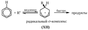 В настоящее время установлено, что при взаимодействии радикалов с ароматическими субстратами первоначально образуется радикал-аддукт (радикальный σ-комплекс), аналогичный по геометрии катионному σ-комплексу в SE-реакциях (гл. 13) или анионному σ-комплексу в SNAr-реакциях (гл. 15) ароматических соединений:
