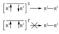 Пунктирная линия между R1 и R2 для радикалов в клетке означает, что в клетке неспаренные электроны у R1• и R2• хотя и слабо, но все же взаимодействуют друг с другом. Радикалы в клетке – это не два свободных радикала, а радикальная пара, которая при термическом инициировании реакции (например, при разложении пероксидов при нагревании) будет находиться в синглетном состоянии (с антипараллельными спинами), а при фотохимическом генерировании радикалов часто, хотя и не всегда, - в триплетном состоянии с параллельными спинами. Синглетные радикальные пары реагируют с образованием продуктов рекомбинации и диспропорционирования быстрее, чем триплетные, так как в триплетной форме перед образованием связи должна произойти инверсия спина: