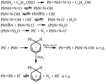 Другим эффективным методом арилирования является реакция Гомберга, которая осуществляется при добавлении NaOH к быстро перемешиваемой смеси водного раствора соли диазония и ароматического субстрата. Однако этот метод менее удобен и надежен, чем разложение диароилпероксидов. В новейшей модификации реакцию Гомберга проводят диазотированием ароматического амина амилнитритом в апротонной среде, т.е. в однофазной системе. Один из предполагаемых механизмов реакции Гомберга в апротонной среде приведен ниже: