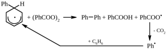 При фенилировании источником фенильных радикалов обычно служит дибензоилпероксид (PhCOO)2, разложение которого первоначально дает бензоилоксирадикалы PhCOO•, разлагающиеся далее до фенильных радикалов. В этом случае пероксид является также окислителем фенилциклогексадиенильных радикалов, что увеличивает выход бифенила:
