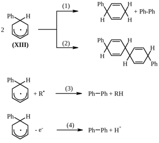 Комплексы типа (XII) выделить не удается, но их образование подтверждается методом ХПЯ, а также характером продуктов, образующихся из этих аддуктов. Например, при фенилировании первоначально образующиеся фенилциклогексадиенильные радикалы (XIII) могут реагировать далее по трем направлениям: (1) диспропорционировать до бифенила и дигидробифенила, (2) димеризоваться с образованием тетрагидрокватерфенила, (3) окисляться до бифенила: