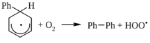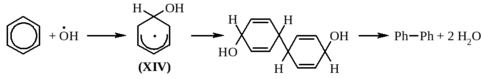 Эти радикалы присоединяются к бензолу, образуя гидроксициклогексадиенильные радикалы (XIV), которые димеризуются, образуя после дегидратации дифенил: