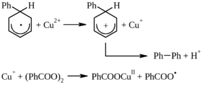 Выход биарилов при фенилировании дибензолпероксидом можно резко поднять, если проводить реакцию в присутствии кислорода или бензоата меди (II) (табл. 14.6).