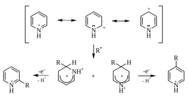Далее происходит алкилирование протонированного субстрата алкильным радикалом по местам наименьшей электронной плотности (α- и γ-):