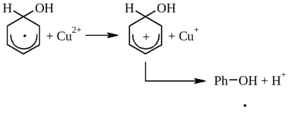 Радикалы (XIV) могут окисляться, и этот путь становится главным в присутствии добавок солей меди (II), железа (III) или кислорода: