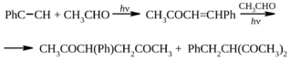 К алкинам присоединение углерод-центрированных радикалов идет не так легко, как к алкенам. При этом образуется примерно равная смесь цис- и транс-аддуктов. Поскольку эти аддукты содержат двойные связи, может наблюдаться повторное присоединение, например: