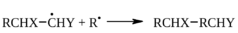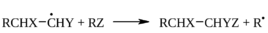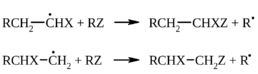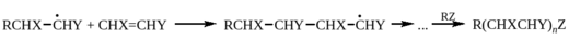 Если радикальный аддукт присоединяется снова к алкену, и эта схему будет повторяться, то наблюдается теломеризация, продукты которой представляют собой смесь теломеров R(CHXCHY)nZ, где n обычно колеблется от 2 до 10: