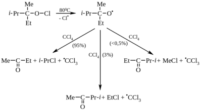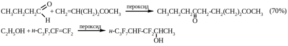Простейшие спирты не присоединяются к алкенам с образованием новых связей C – O, поскольку обычные методы инициирования приводят к разрыву связи С – H, которая менее прочна, чем связь O – H. Однако перфторалкокси-радикалы из перфторированных спиртов присоединяются очень легко.