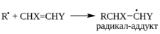 Для образования новой связи углерод-углерод используют радикалы с радикальны центром на атоме углерода. Обычно механизм этой реакции цепной, приводящий к 1:1-аддукту: