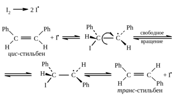Фрагментироваться может также и первоначально присоединившийся радикал, т.е. присоединение R• к кратной связи может быть обратимым. Эту реакцию используют для (цис→транс)-изомеризации алкенов: