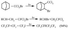 В качестве инициаторов чаще всего используют пероксиды, азосоединения и УФ- свет. Побочным процессом является теломеризация. Особенно полезны для получения 1:1-аддуктов с алкенами полигалогеналканы: CCl4, CCl3Br и др. Следует использоваться полигалогеналканы, содержащие не менее трех атомов галогена, легкость переноса галогена для смешанных полигалогеналканов уменьшается в ряду: CX3I > CX3Br > CX3Cl: